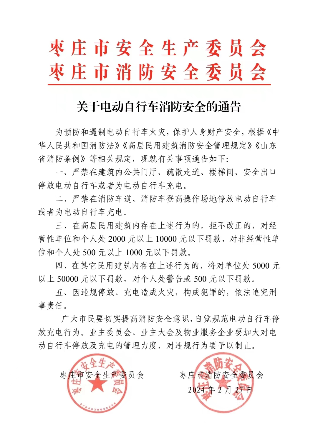 日前,枣庄市安委办会同市消安办联合下发《关于集中开展住宅小区等重点场所电动自行车消防安全管理专项检查的紧急通知》。自即日起至3月底,在全市范围内开展针对居民住宅小区、写字楼、办公楼、大型商业设施等重点场所电动自行车消防安全管理专项检查。